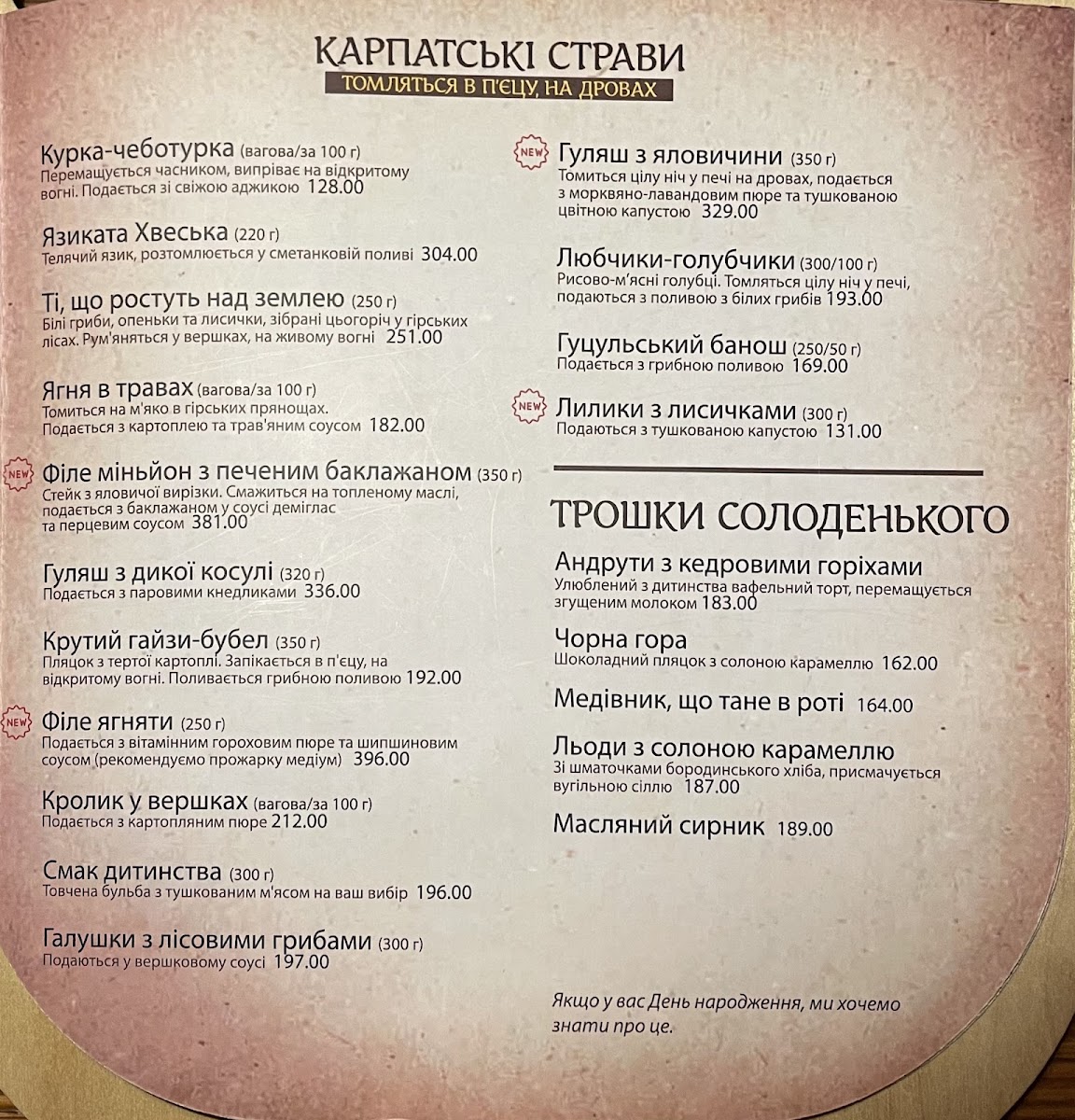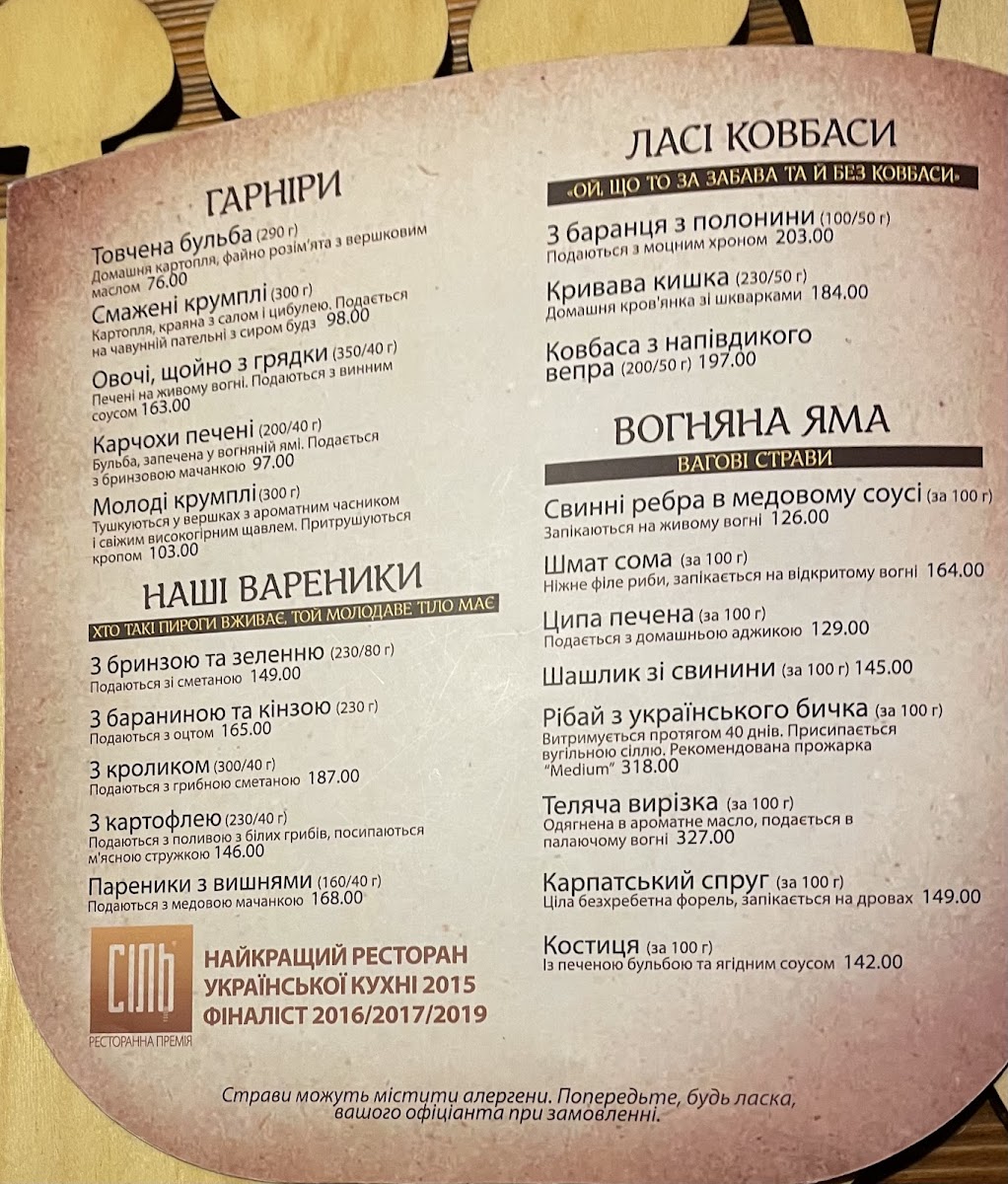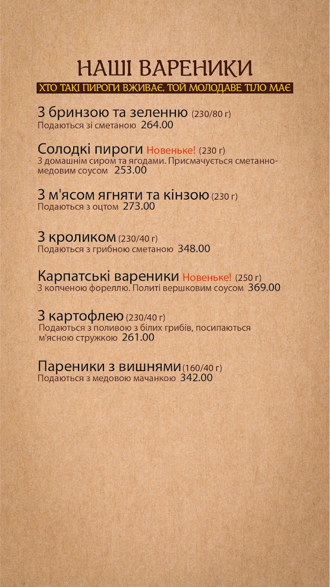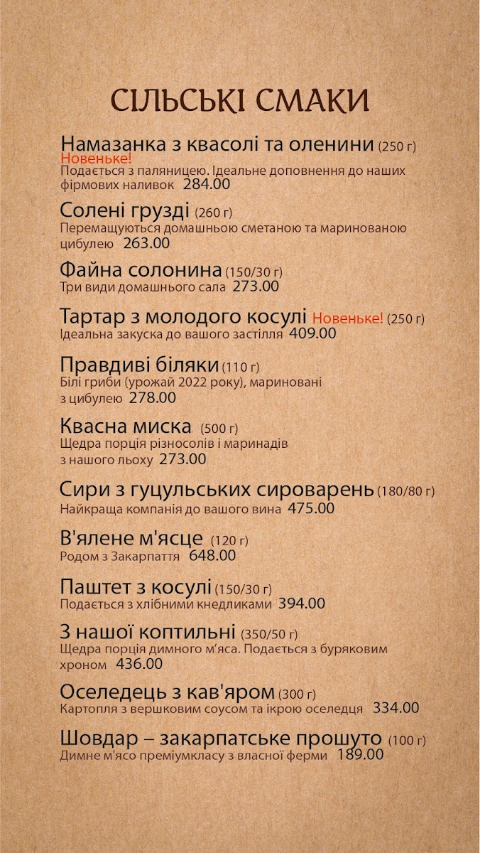 The menu’s drink offerings include both traditional spirits such as Самогон and various настоянки (infused tinctures), adding a local, handcrafted feel to the experience. Even sweet treats like Медiвник Що Тане В Ротi (honey cake) provide a gentle finish to any meal.
