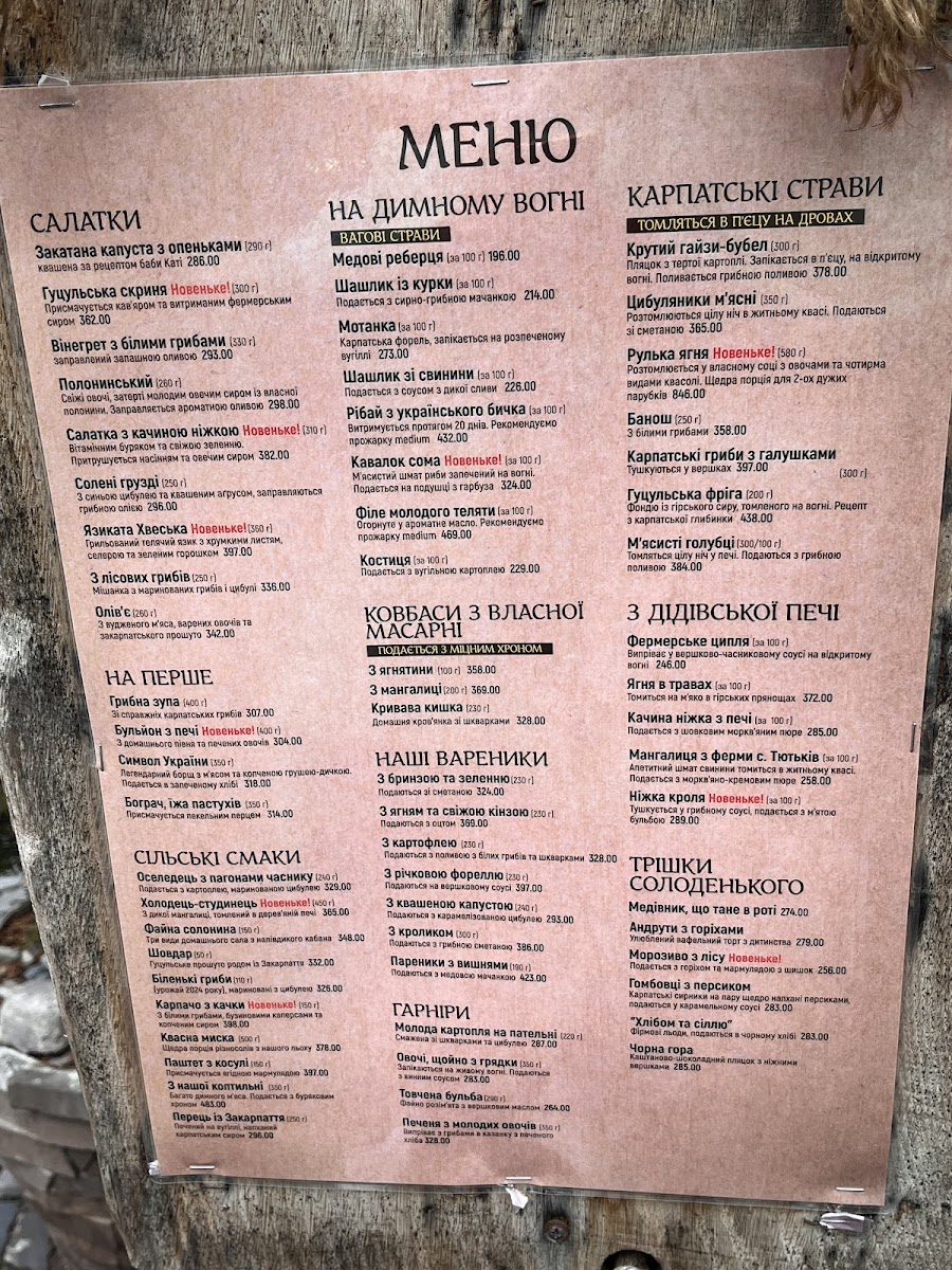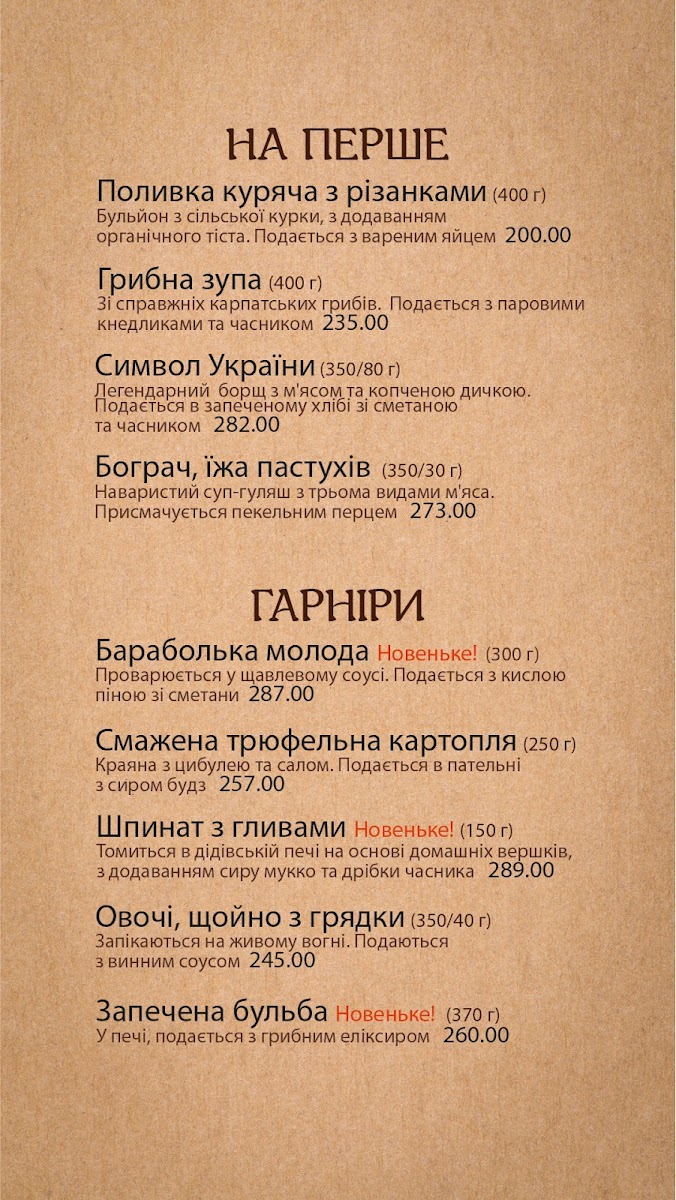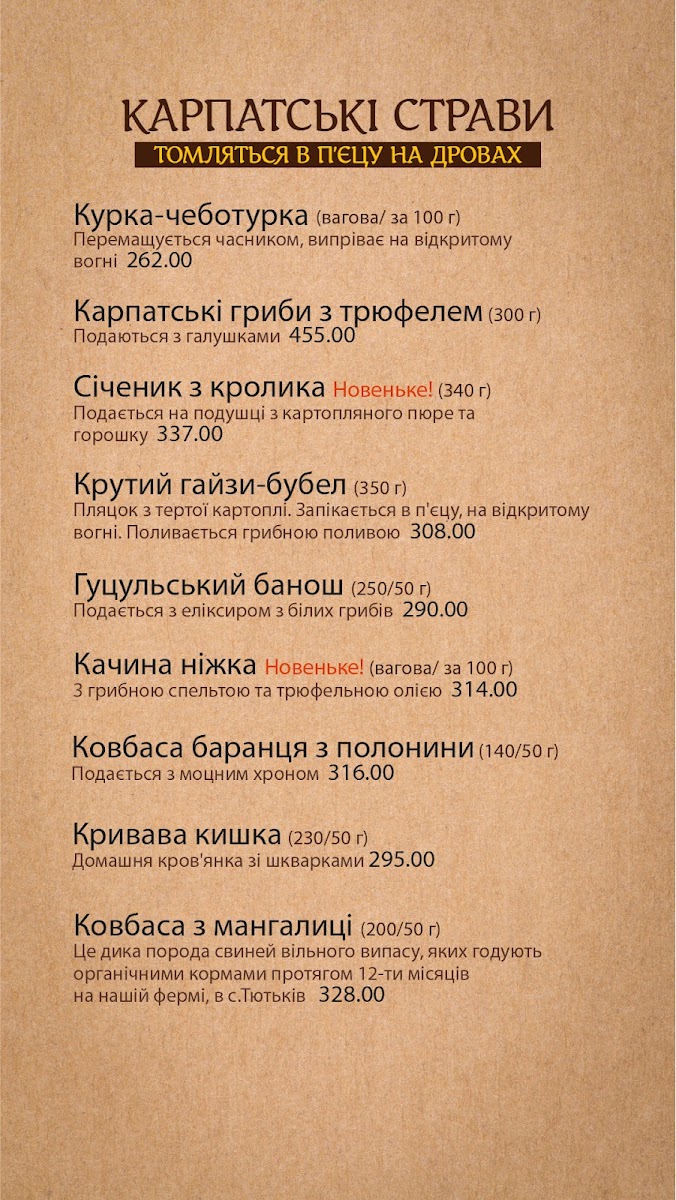 Guests often enjoy rich, warming dishes like Chanakhi with Mutton or Грибна Юшка (mushroom soup) during cooler afternoons or as a satisfying dinner option. For lighter bites or snacks, items such as Сало З Часником (garlic-cured pork fat) and savory Дерун З Грибною Підливкою (potato pancakes with mushroom sauce) offer simple, rustic flavors that complement the relaxed setting.